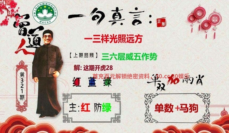 | 321期:一三祥光照远方 解:祥光,解吉美生肖蛇龙马兔羊鸡 六肖:蛇龙马兔羊鸡 主码:13.25.02.26.12.36.03.27.23.33 |